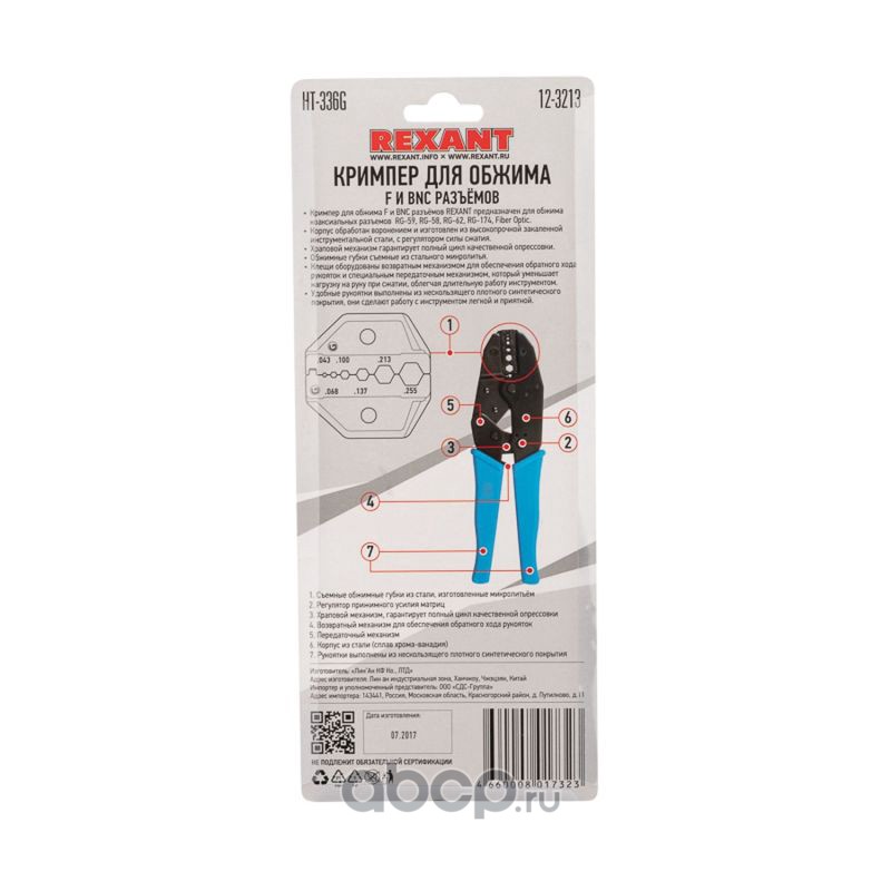 Кримпер REXANT HT-301 G для обжима F и BNC разъемов RG-59, RG-58, RG-62, RG-174, Fiber Optic