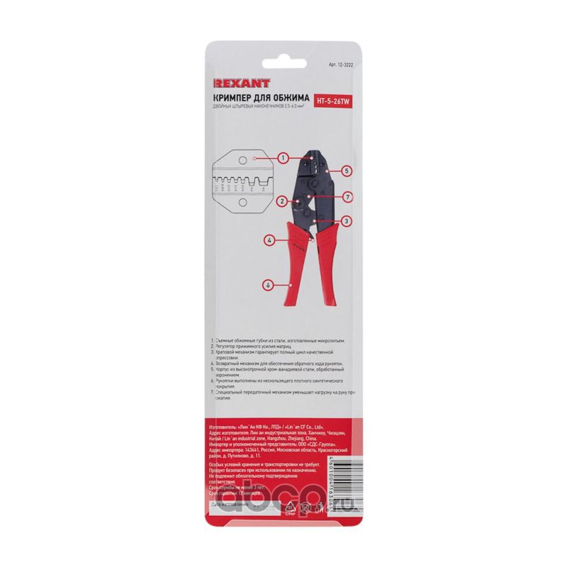Кримпер REXANT HT-6010 для обжима неизолированных наконечников и гильз 1.5-16.0 мм²