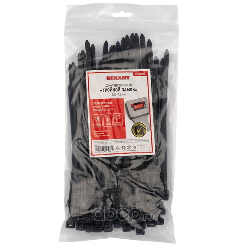 Хомут стяжка нейлоновая с тройным замком REXANT200x7,5 мм, черная, упаковка 100 шт.