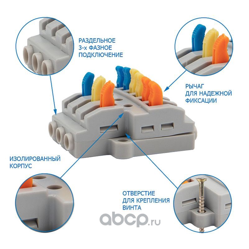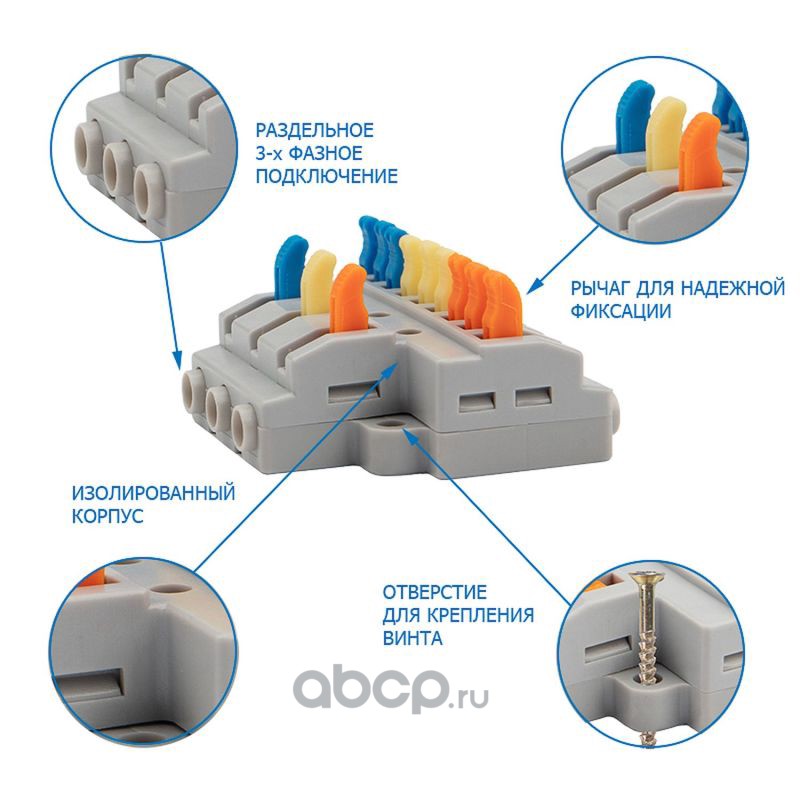 Клемма СМК 3х2 проходная разветвительная 3 полюса, с монтажной площадкой (1 ввод, 2 вывода на полюс) (50 шт./уп.) REXANT