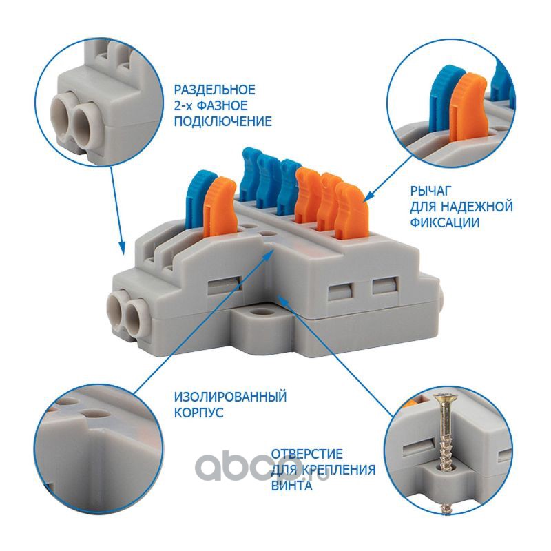 Клемма СМК 2х2 проходная разветвительная 2 полюса, с монтажной площадкой (1 ввод, 2 вывода на полюс) (50 шт./уп.) REXANT