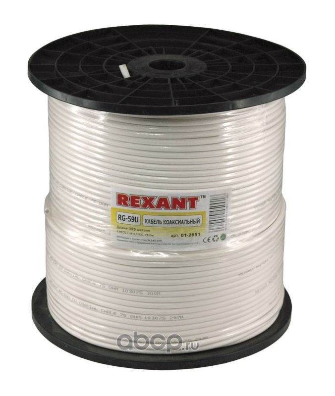 Кабель коаксиальный REXANT RG-59U+Cu, 75 Ом, Cu/Al/Cu, 64%, бухта 305 м, белый