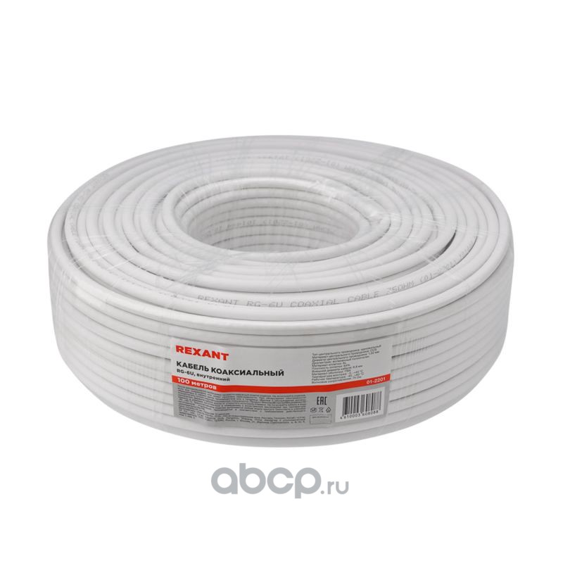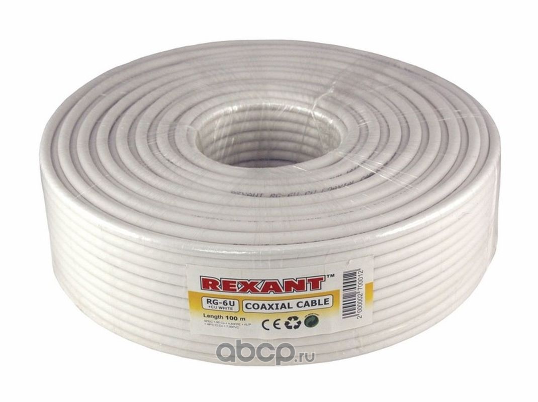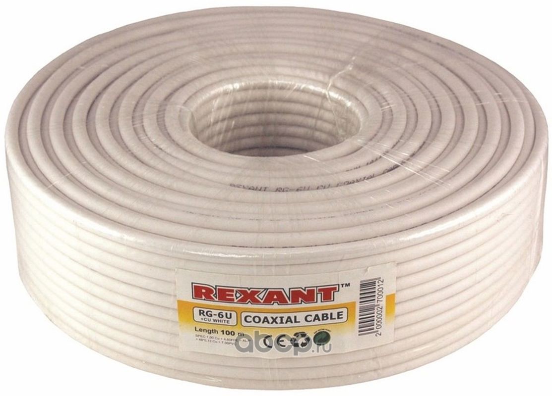 Кабель коаксиальный REXANT RG-6U+Cu, 75 Ом, Cu/Al/Cu, 75%, бухта 100 м, белый