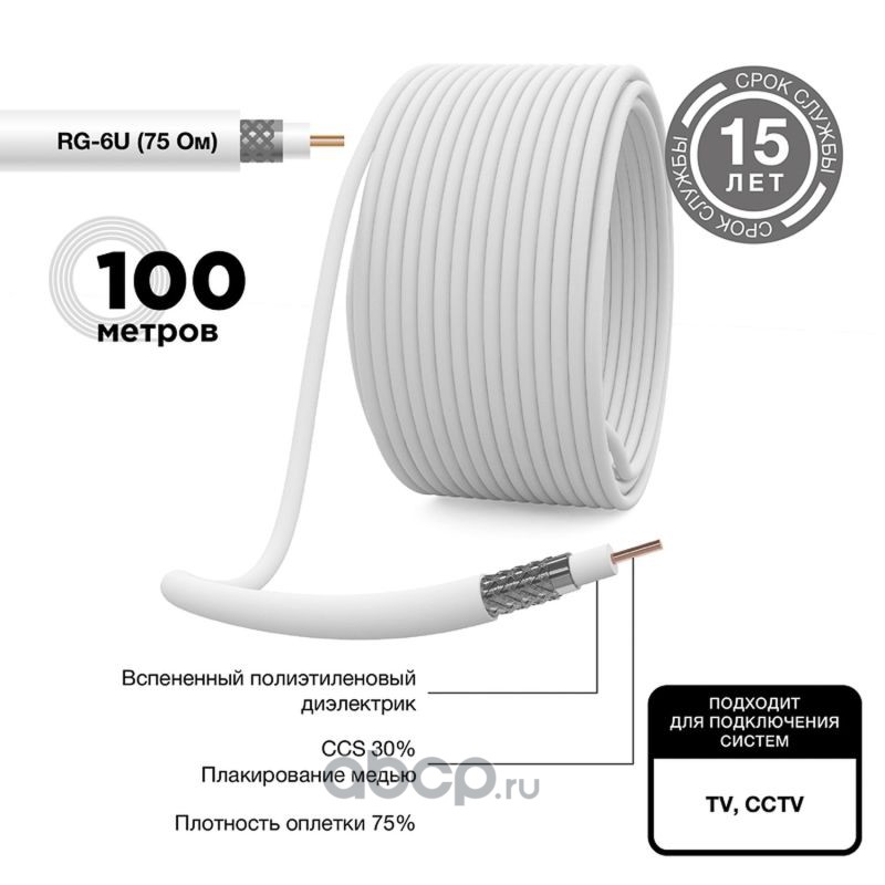 Кабель коаксиальный REXANT RG-6U, 75 Ом, CCS/Al/Al, 64%, бухта 100 м, белый