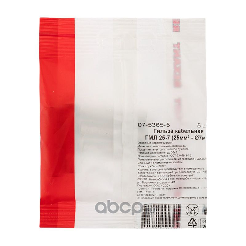 Гильза кабельная медная луженая ГМЛ 25-7 (25мм² - Ø7мм) ГОСТ 23469.3-79 (в упак. 5 шт.) REXANT