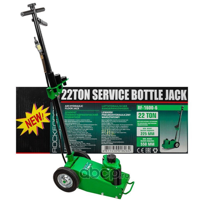 | ROCK FORCE | RF16006 | Домкрат пневмогидравлический подкатной 22т в комплекте со сменными надставками-удлинителями (h min-225mm, h max-430mm) | ||