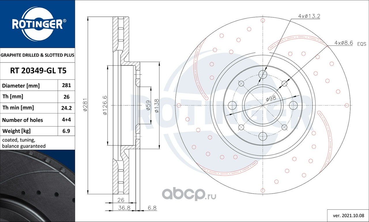 | ROTINGER | RT21148GLT5 | Диск тормозной графитовый с двойной перфорацией и насечками | ||