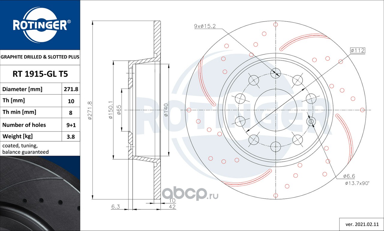 | ROTINGER | RT2208GLT5 | Диск тормозной графитовый с двойной перфорацией и насечками | ||
