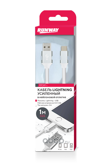 | RUNWAY | RR341I | Кабель усилен. в нейлоновой оплетке, Lightning, для iPhone/iPad/iPod, 1м, белый | ||