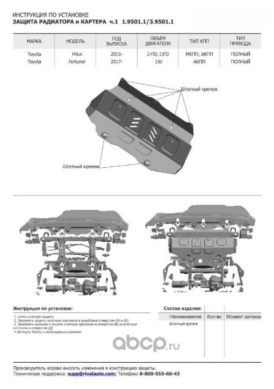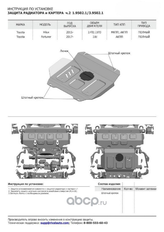 | Rival | K33357701 | Защита радиатора, картера, КПП и РК Toyota Fortuner крепеж в комплекте алюминий 4 мм серый Rival | ||