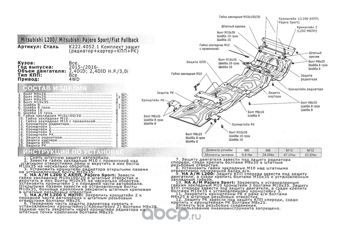 | Rival | K22240521 | К-т защит Fiat Fullback/Mitsub L200/Pajero Sport | ||