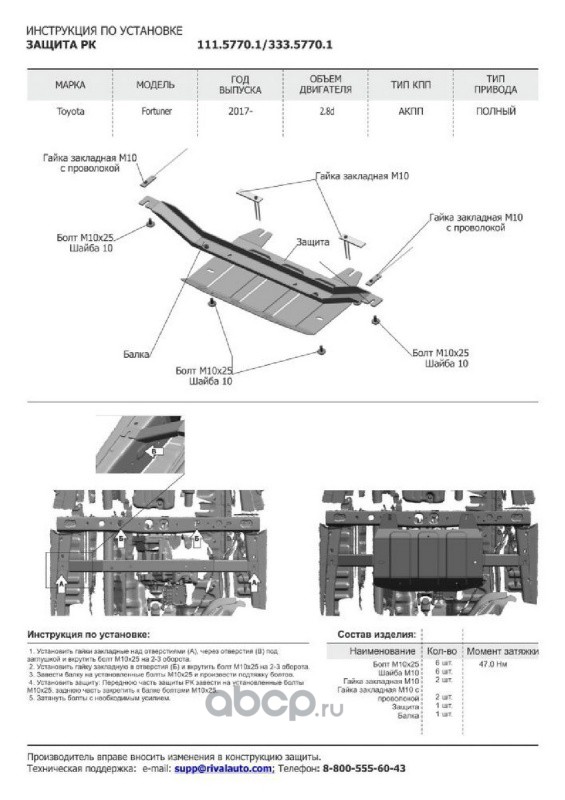 | Rival | 33357701 | Защита РК Toyota Fortuner 4WD 2017-, 333.5770.1 | ||