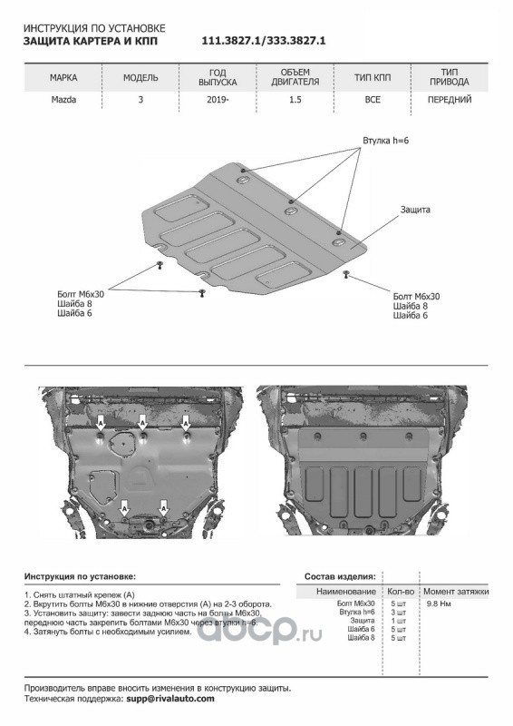 | Rival | 11138271 | ЗК+КПП Mazda 3 BP АКПП 2019-2020, st 1.8mm | ||