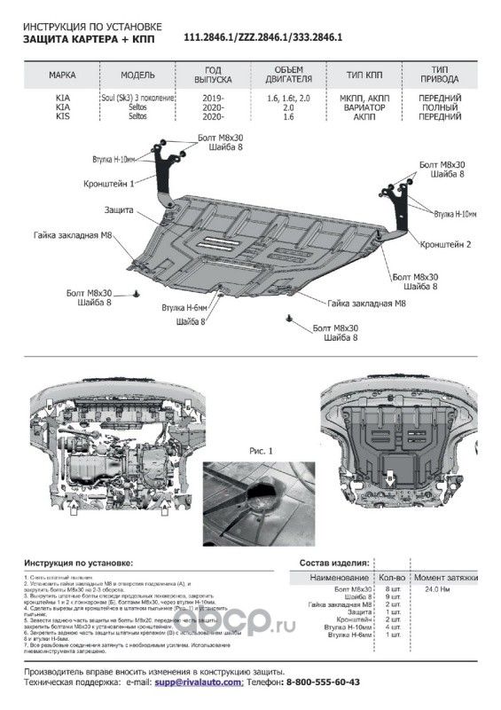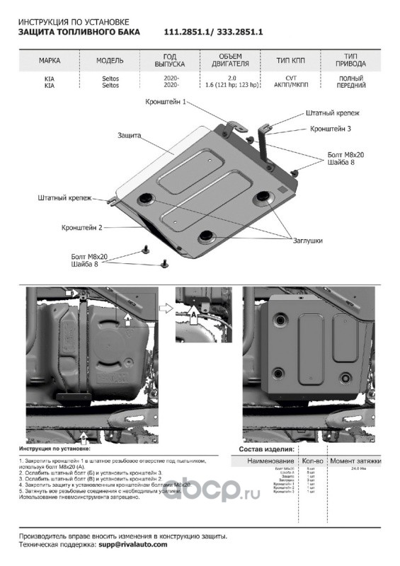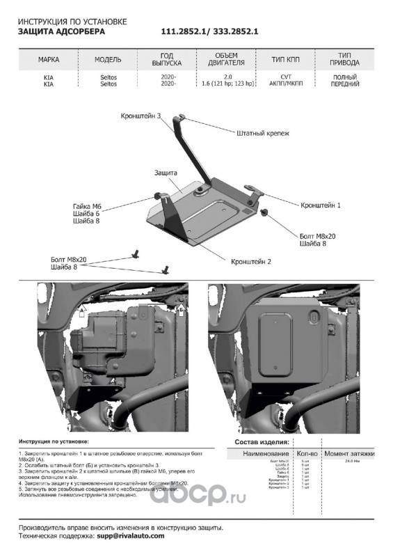 | Rival | K33328511 | Комплект защит Kia Seltos FWD/4WD 2020-, al 3mm | ||