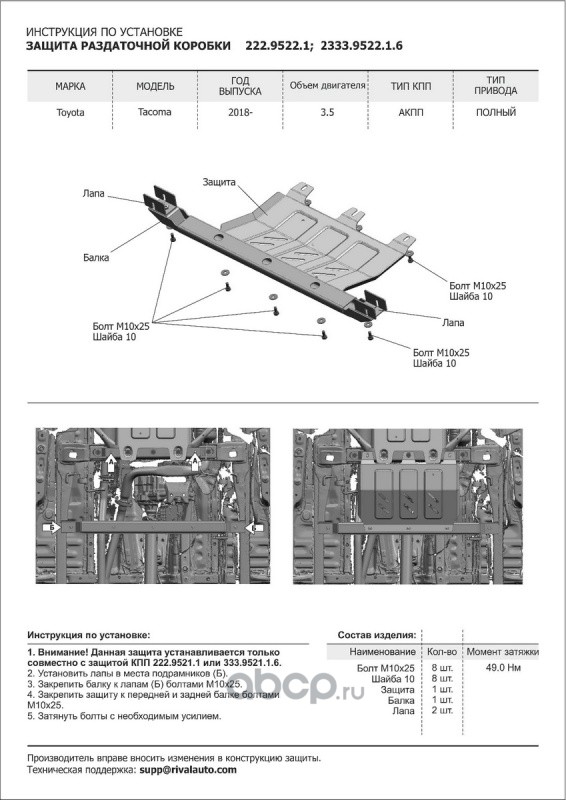 | Rival | 2333952116 | Защита КПП Toyota Tacoma 4WD 15-19 19-, al 6mm | ||