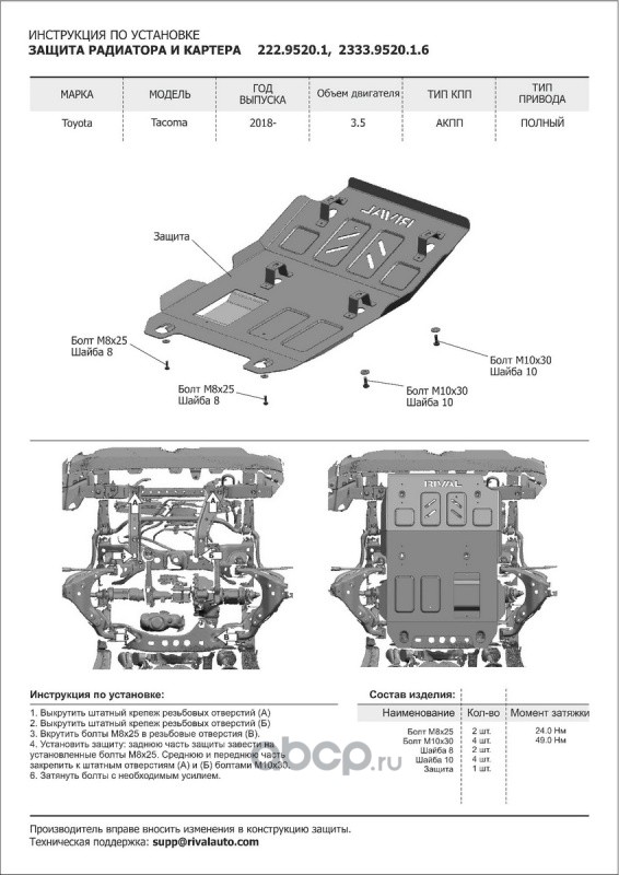 | Rival | 2333952216 | Защита РК Toyota Tacoma 4WD 15-19 19-, al 6mm | ||