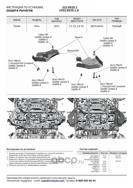 | Rival | 2333952516 | Защита передних рычагов Toyota Hilux 4WD 2015- | ||