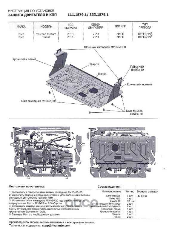 | Rival | 33318791 | ЗК+КПП Ford Tourneo Custom/Transit FWD 12-, al 4mm | ||