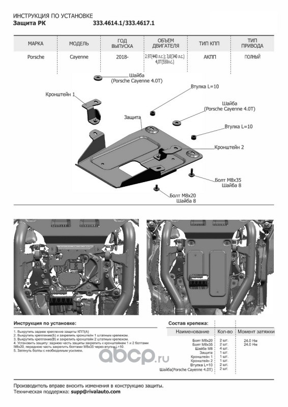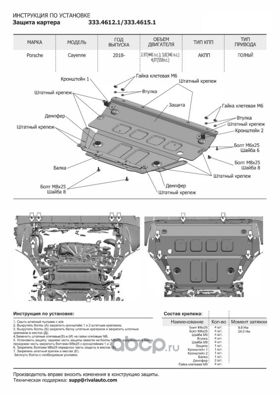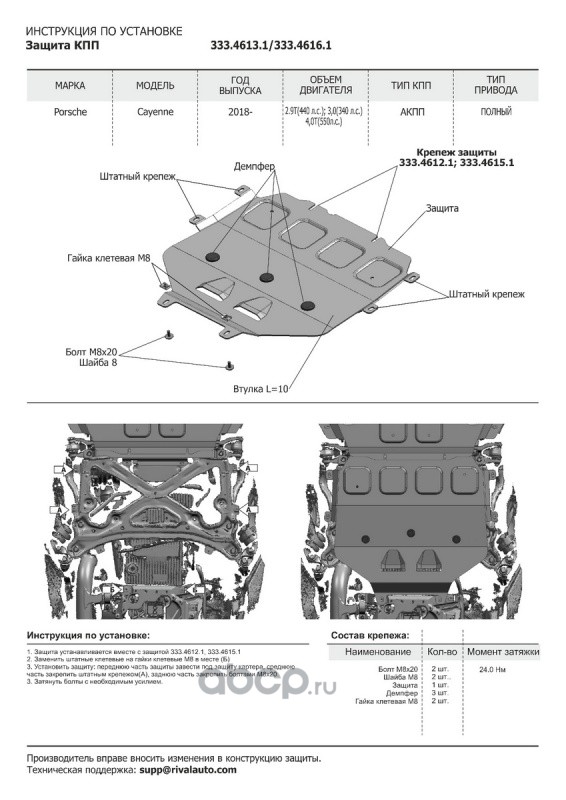 | Rival | 33346121 | Защита картера Porsche Cayenne III 2017-, al 4mm | ||
