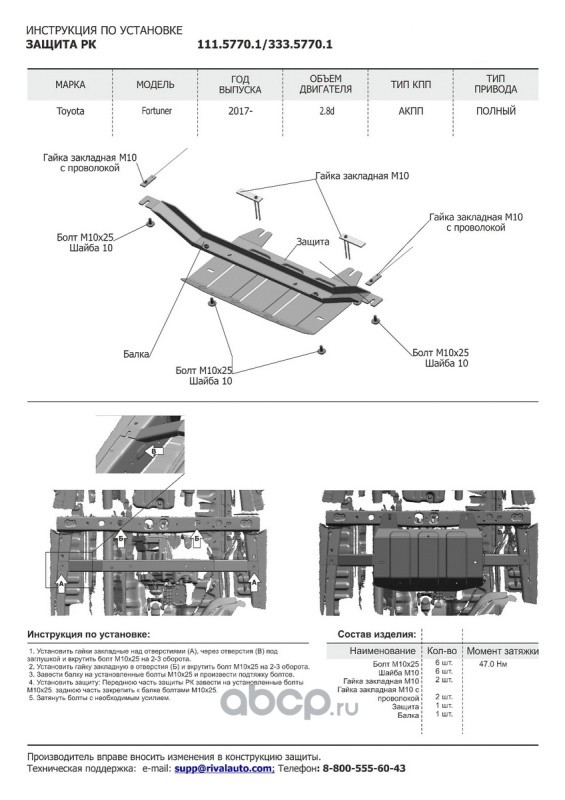| Rival | K11157701 | К-т защит Toyota Fortuner 4WD 17-, st 1.8mm, 4 ч | ||