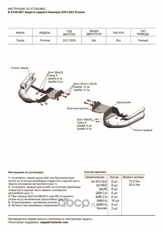 | Rival | R5720007 | Защ.зад.бампера d76+d42 уголки Toyota Fortuner 17- | ||