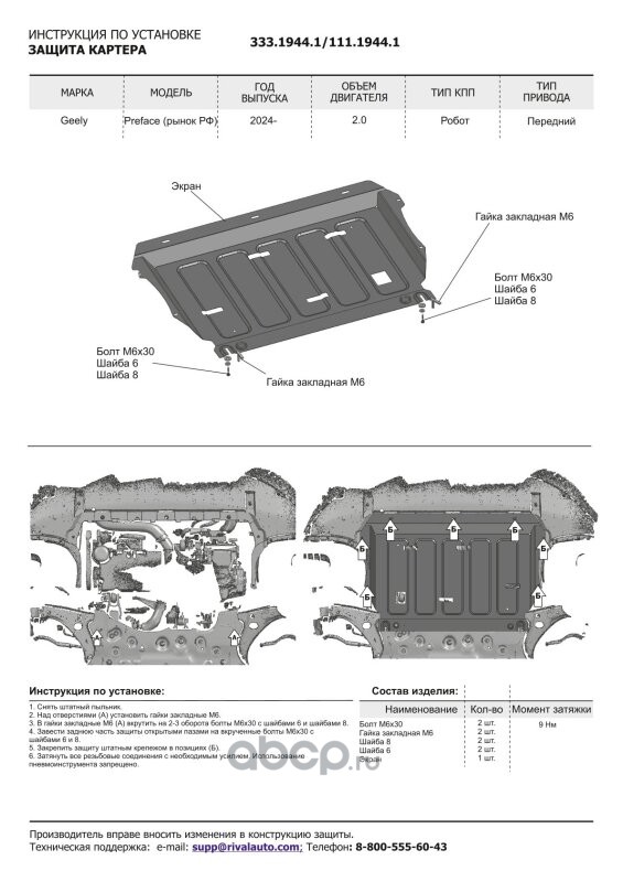 | Rival | 11119441 | Защита картера, сталь 1.5 мм, с крепежом, штампованная | ||