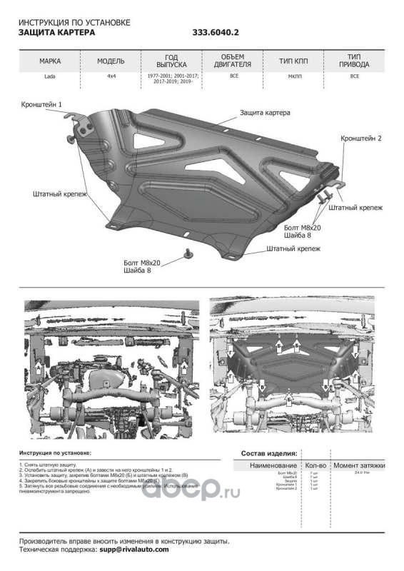 Защита картера, КПП и РК Rival для Lada (ВАЗ) 2121 (4x4) 1977-2021/2131 (4x4) 1993-2021/Niva Legend 2121 2021-н.в./2131 2021-н.в., алюминий 3 мм, с крепежом, штампованная, 333.6040.2