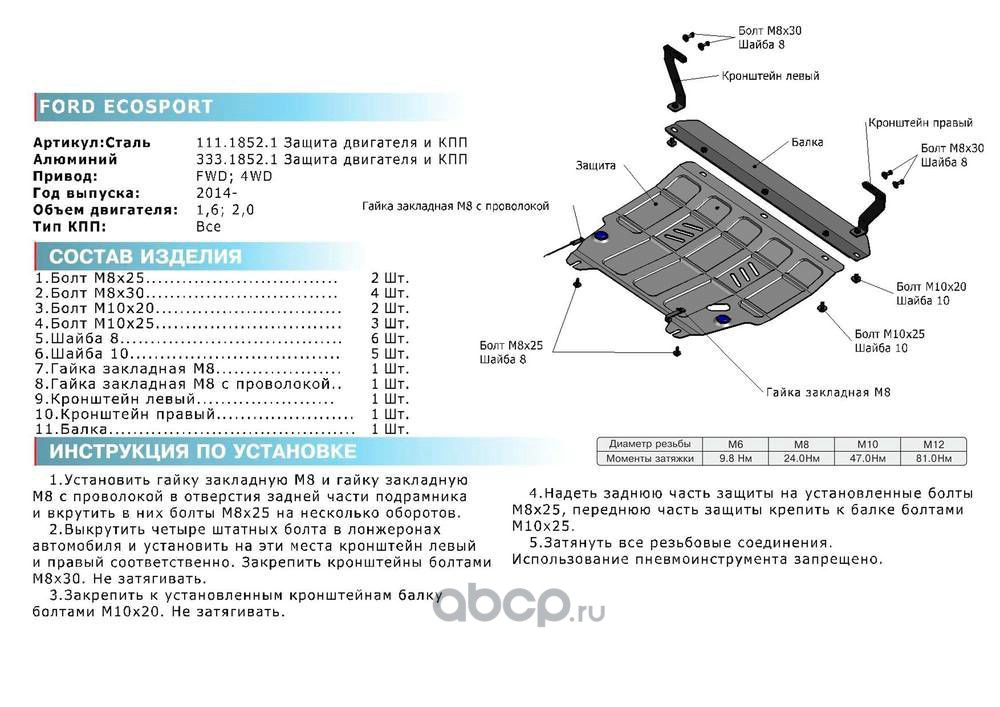 | Rival | 33318521 | ЗК и КПП Ford EcoSport 2014-2018, al 4mm | ||