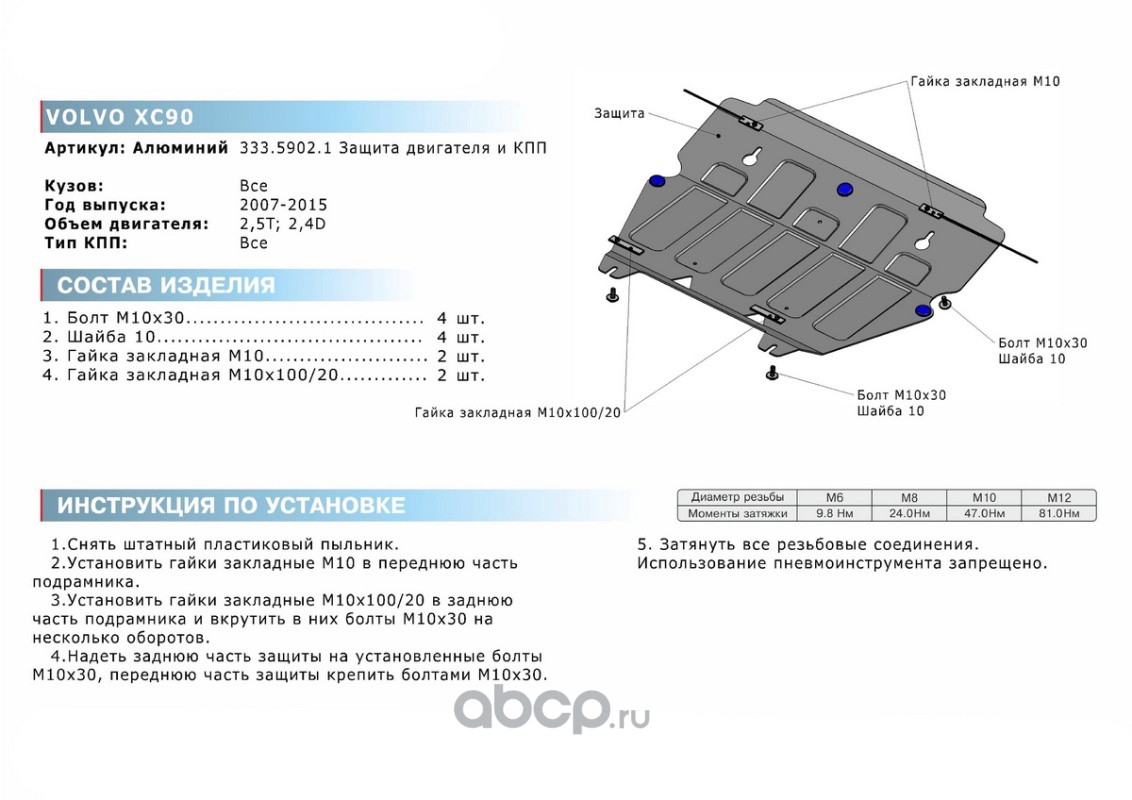 | Rival | 33359021 | ЗК+КПП Volvo XC90 I 2006-2014, al 4mm | ||