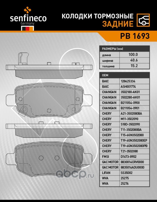 | SENFINECO | PB1693 | Колодки тормозные задние | ||