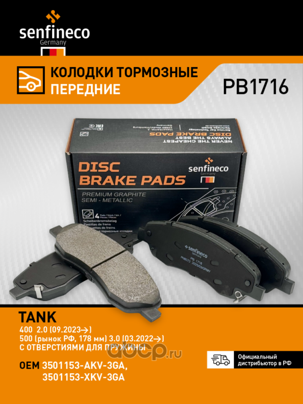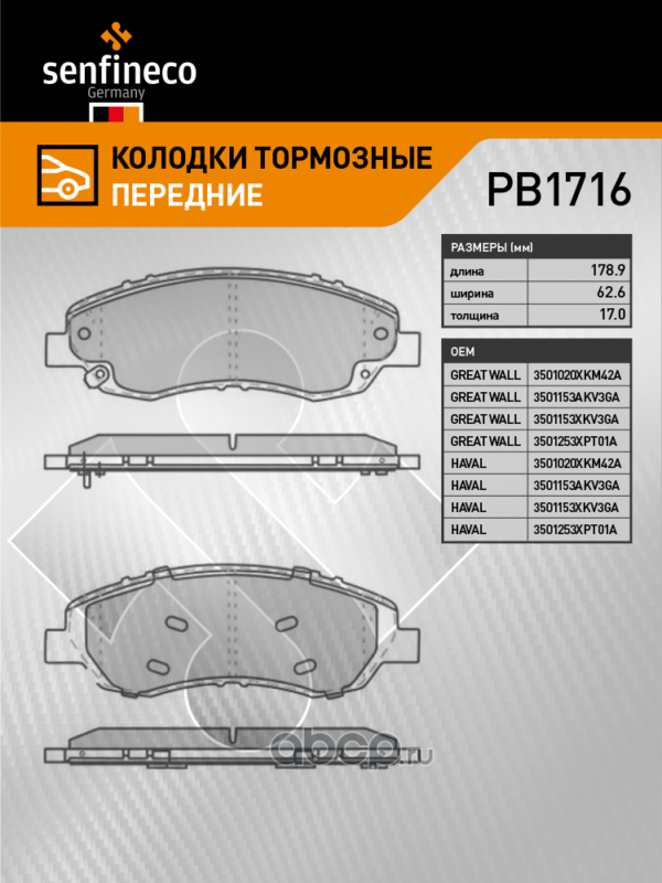 | SENFINECO | PB1716 | Колодки тормозные передние | ||