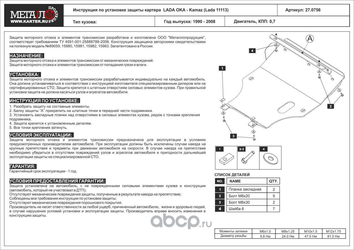 Защита картера для LADA OKA - Kamaz (Lada 11113), 1990-2008, сталь 2,0 мм