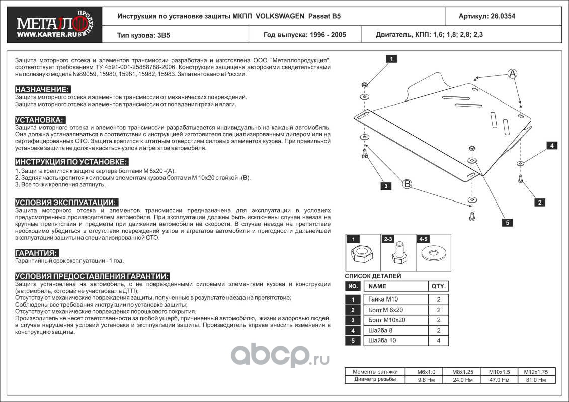 Защита МКПП для AUDI A 4, 1995-2001; B5,AUDI A 6, 1997-2004, 4B, VOLKSWAGEN Passat B5, 1996-2005, сталь 2,0 мм