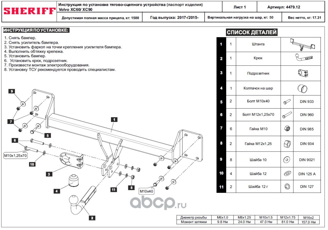 ТСУ для VOLVO XC 90 2015 - ,Тип шара- A,, Горизонт / Верт нагрузка на шар 1 500 / 50