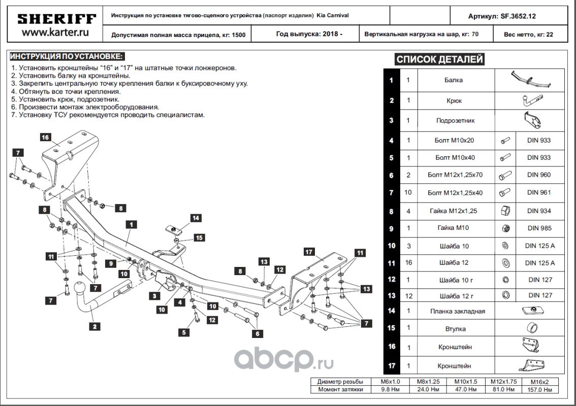 ТСУ для KIA Carnival ( lll поколение ) 2014 - 2021,Тип шара- A,, Горизонт / Верт нагрузка на шар 1 500 / 50