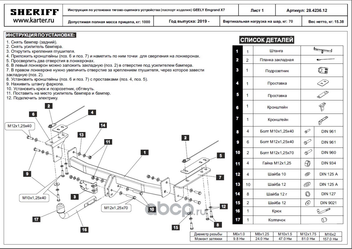 ТСУ для GEELY Emgrand X7 2019 - 2021,Тип шара- A,, Горизонт / Верт нагрузка на шар 1 200 / 70