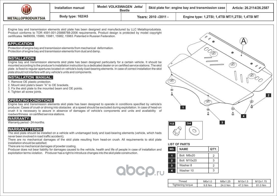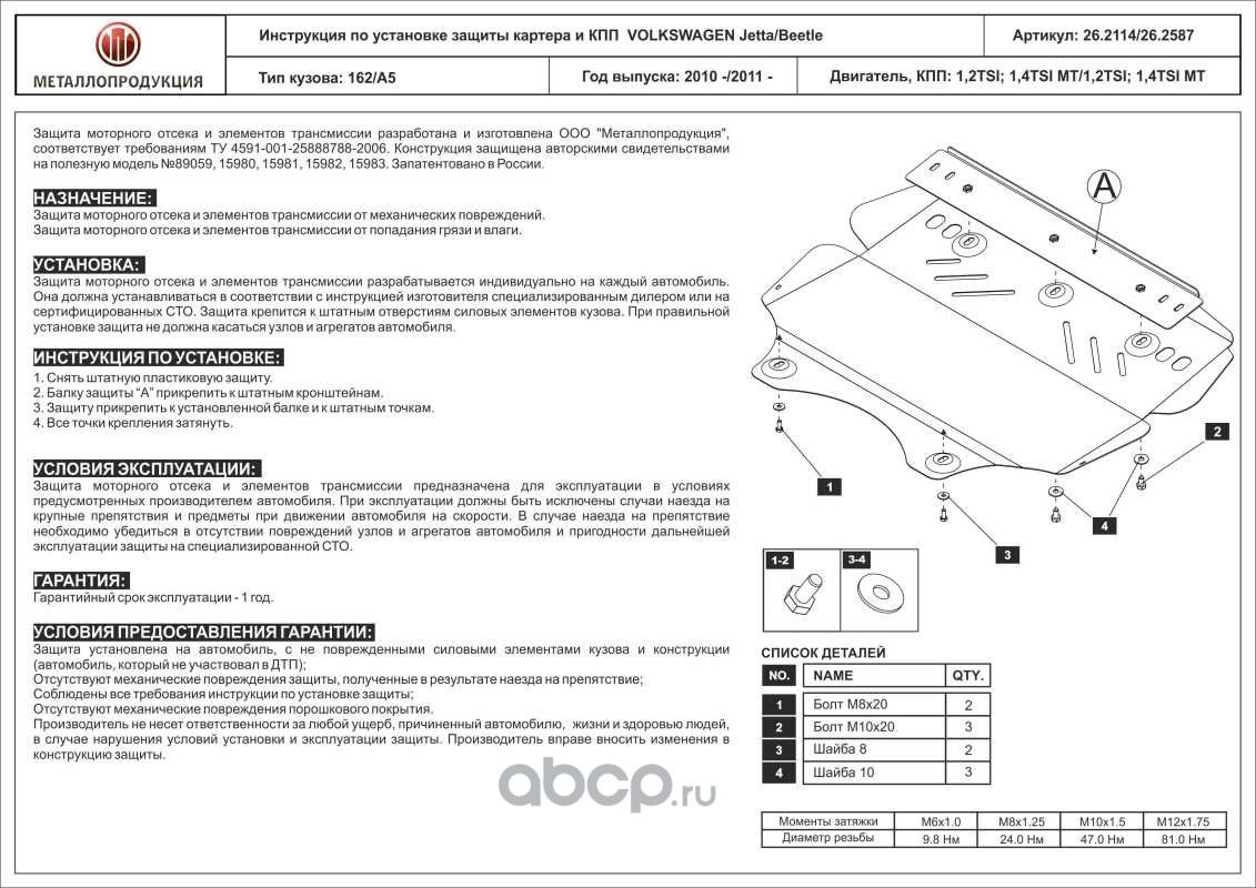 Защита картера двигателя и КПП VW Jetta V- 1,2TSI 1.4TSI MT, 2011- Сталь 2 мм