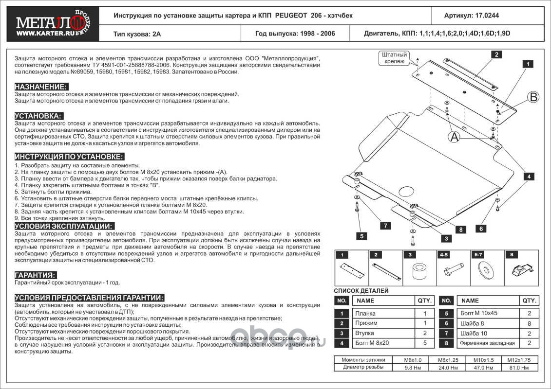Защита картера и КПП для PEUGEOT 206, 1998-2006, HB, сталь 2,0 мм