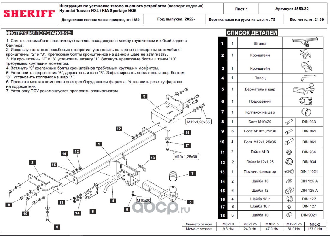 ТСУ для KIA Sportage 2022 - ,Тип шара- E,, Горизонт / Верт нагрузка на шар 1 650 / 75