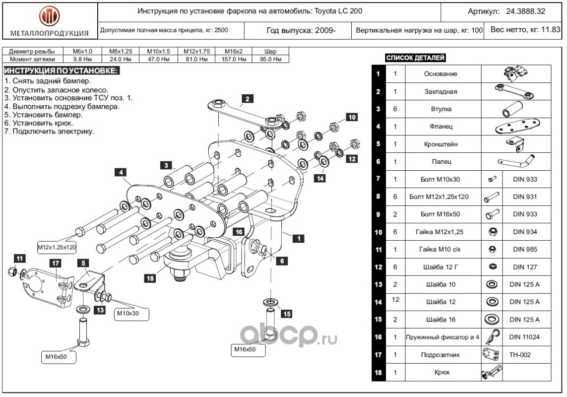 ТСУ для TOYOTA Land Cruiser 200 2007 - ,Тип шара- E,, Горизонт / Верт нагрузка на шар 2 500 / 75
