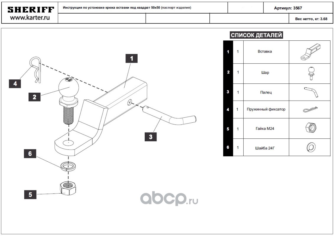 ТСУ Вставка Шаровый узел 50х50 на базе шара типа E, d=24мм