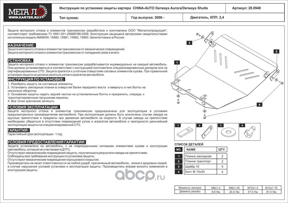 Защита картера для CHINA-AUTO Derways Shutle, 2006-2007, сталь 2,0 мм