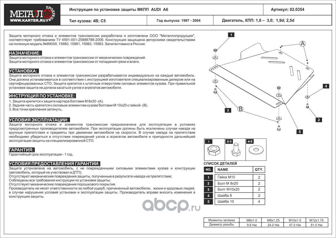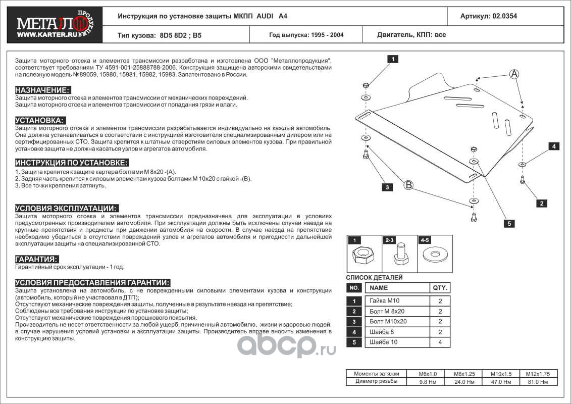 Защита МКПП для AUDI A 4, 1995-2001; B5,AUDI A 6, 1997-2004, 4B, VOLKSWAGEN Passat B5, 1996-2005, сталь 2,0 мм