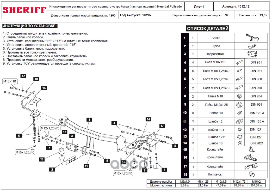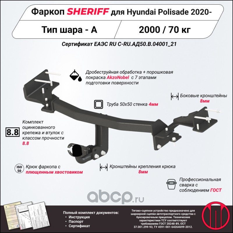 ТСУ для HYUNDAI Palisade 2020 - ,Тип шара- A,, Горизонт / Верт нагрузка на шар 1 200 / 70