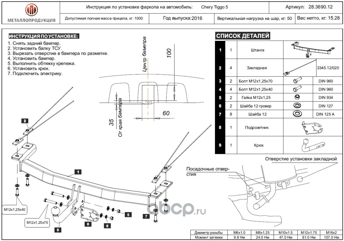 ТСУ для CHERY Tiggo 5 2017 - 2020,Тип шара- A,, Горизонт / Верт нагрузка на шар 1 000 / 50
