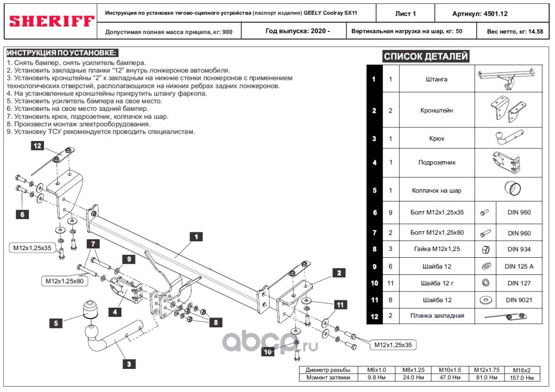 ТСУ для GEELY Coolray SX11 2020 - ,Тип шара- A,, Горизонт / Верт нагрузка на шар 900 / 50