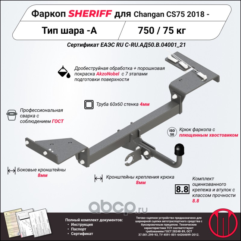 ТСУ для CHANGAN CS75 2018 - ,Тип шара- A,, Горизонт / Верт нагрузка на шар 750 / 75