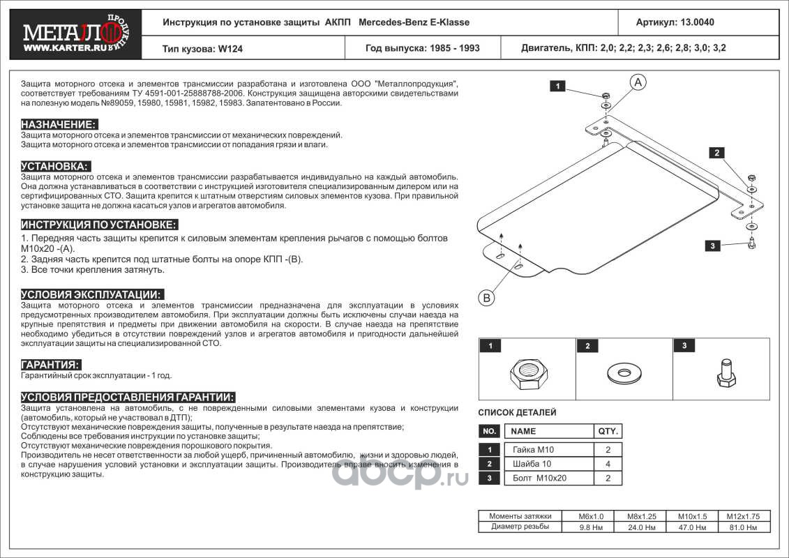 Защита АКПП для Mercedes-Benz E-Klasse, 1985-1993, W124, сталь 2,0 мм