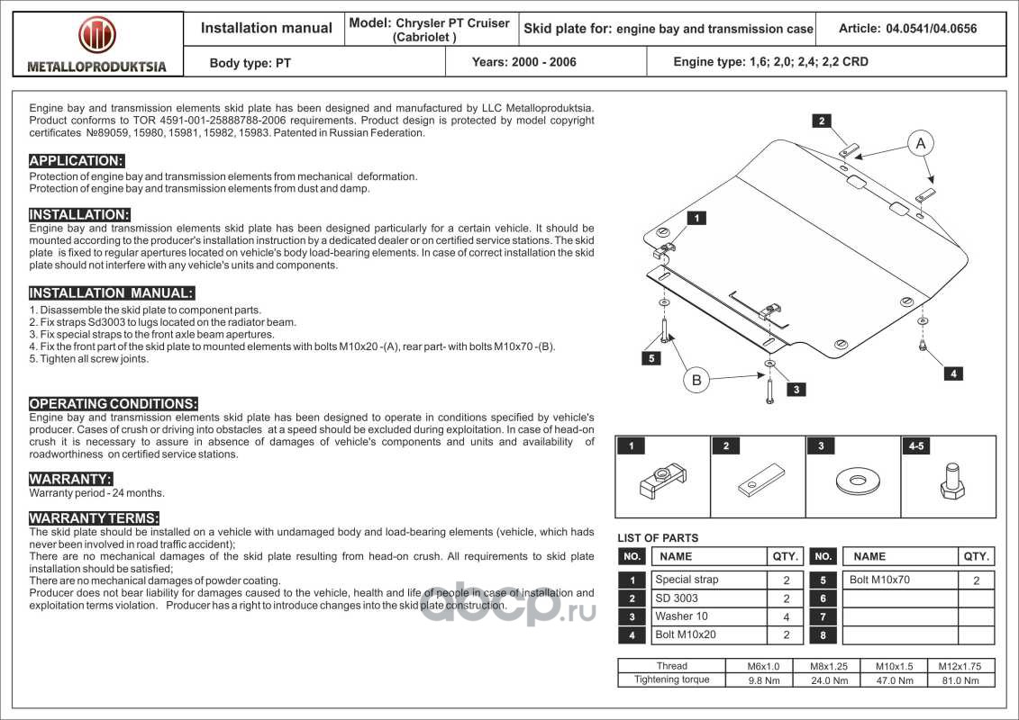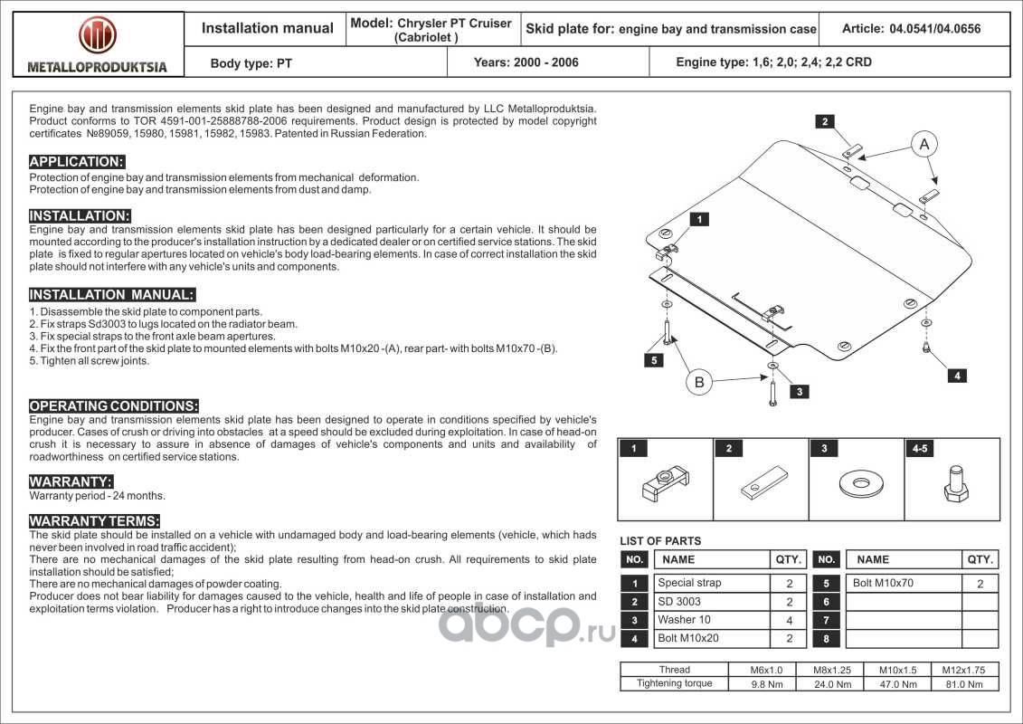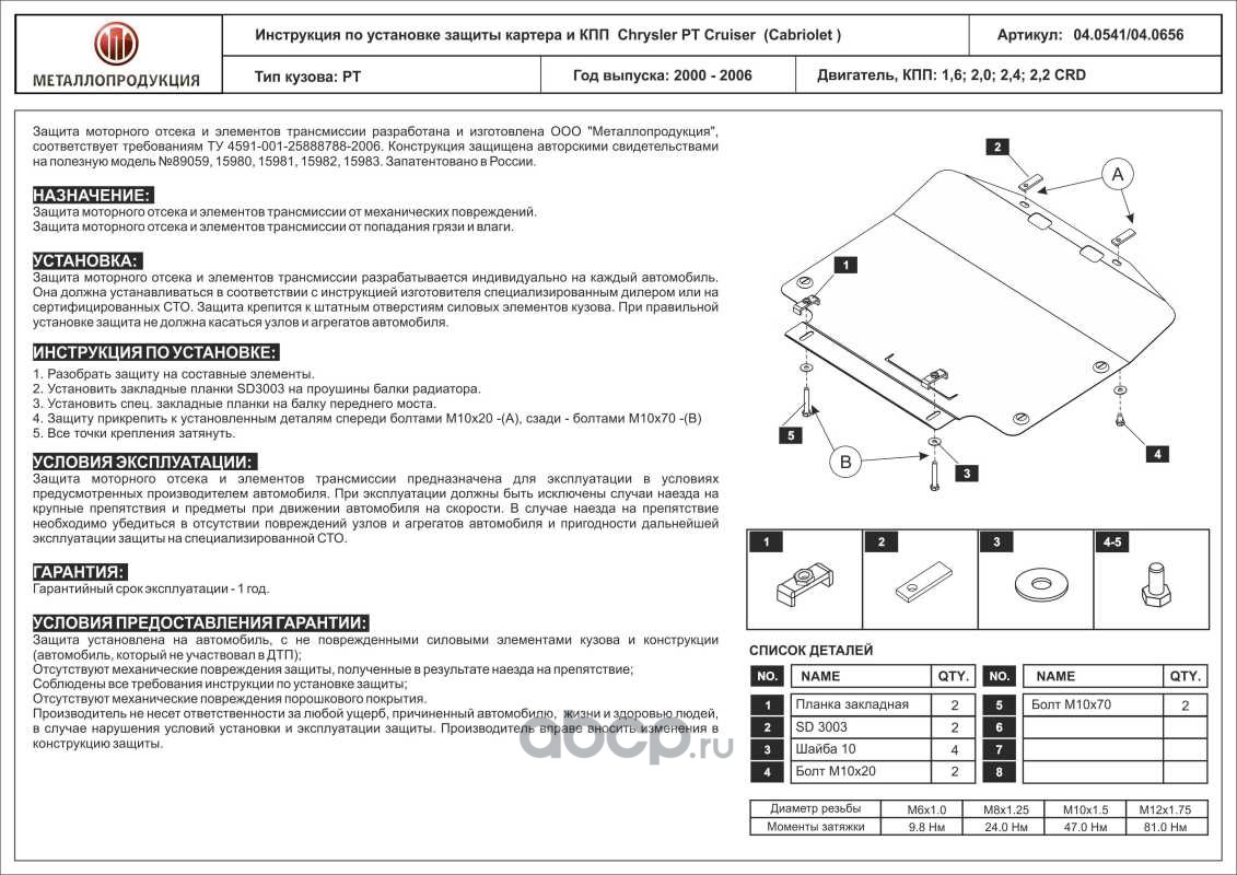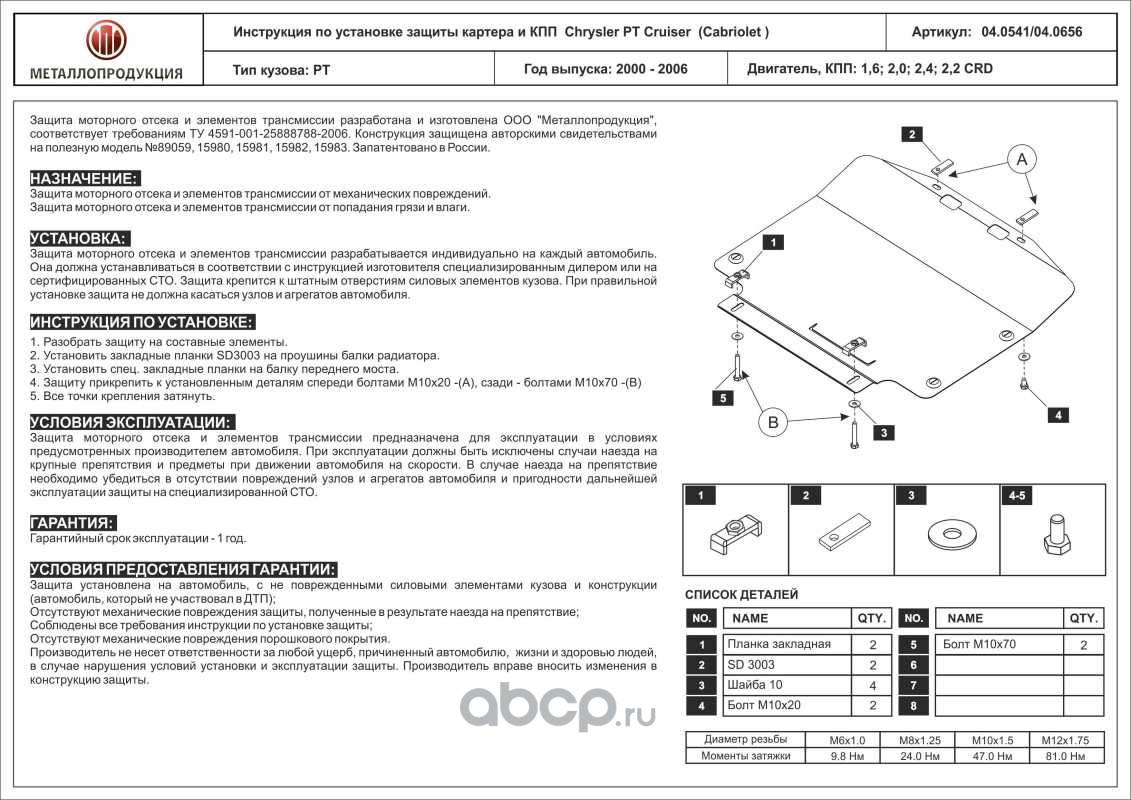 Защита картера и КПП для CHRYSLER PT Cruiser, 2000-2006, PT, сталь 2,0 мм