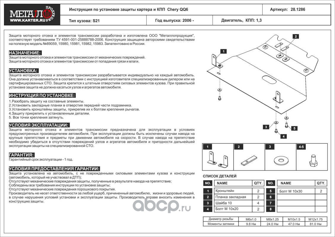Защита картера и КПП для CHERY QQ6, 2006-, S21, сталь 2,0 мм